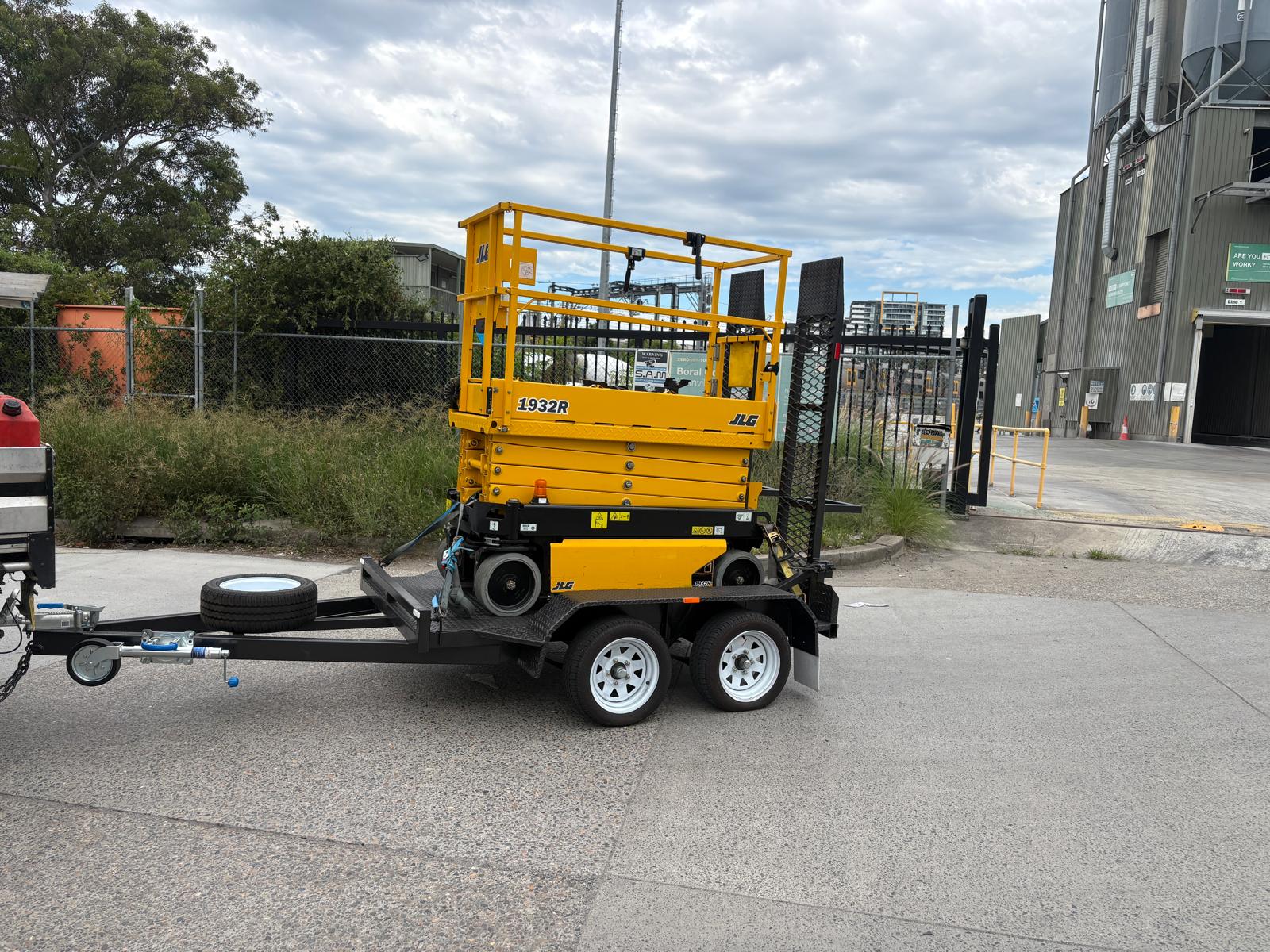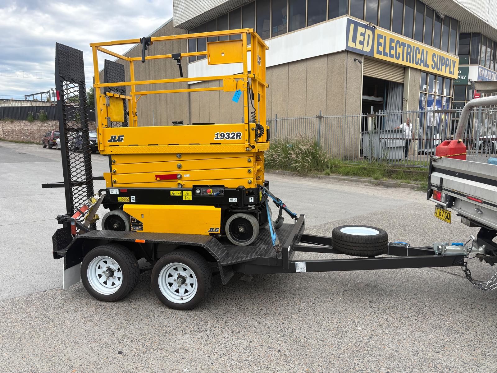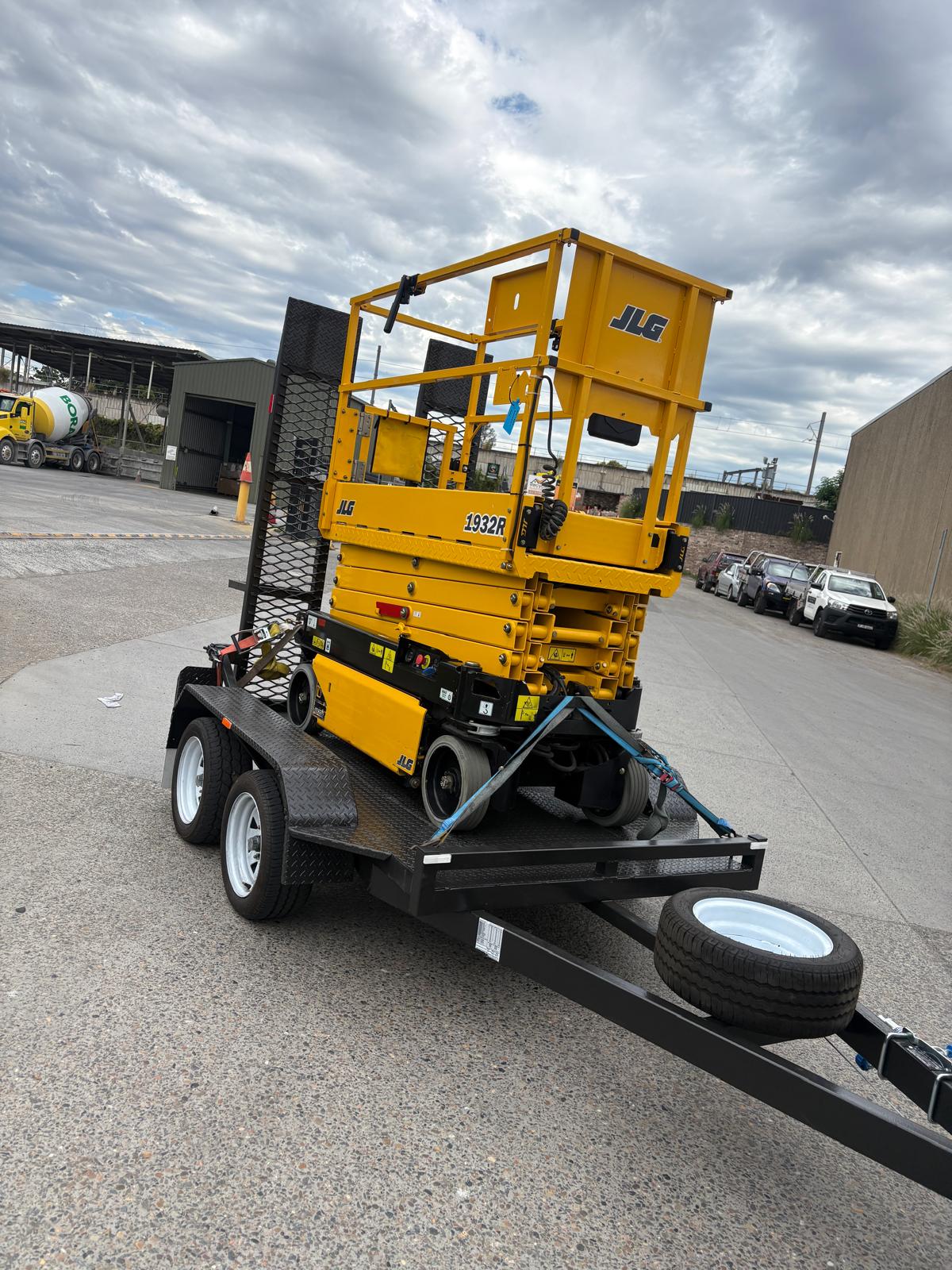 Heavy duty scissor lift and plant trailer built for compact machinery transport. This 2000kg ATM tandem axle trailer features a low profile deck, checker plate floor, twin rear loading ramps, front mechanical override brakes, LED lights, 7 pin flat plug, and 4 tie down points. Ideal for scissor lifts, access equipment, and small plant machinery.